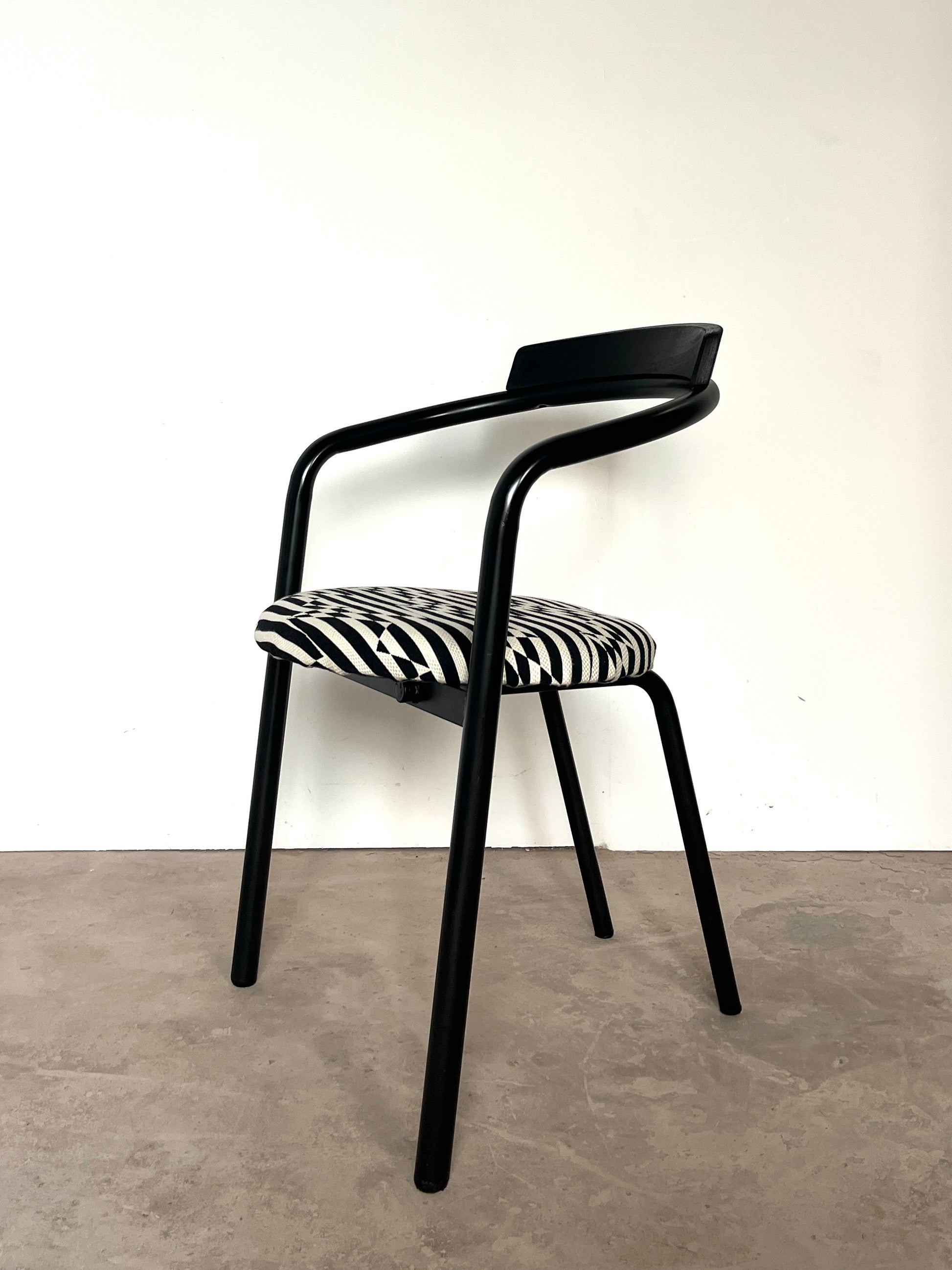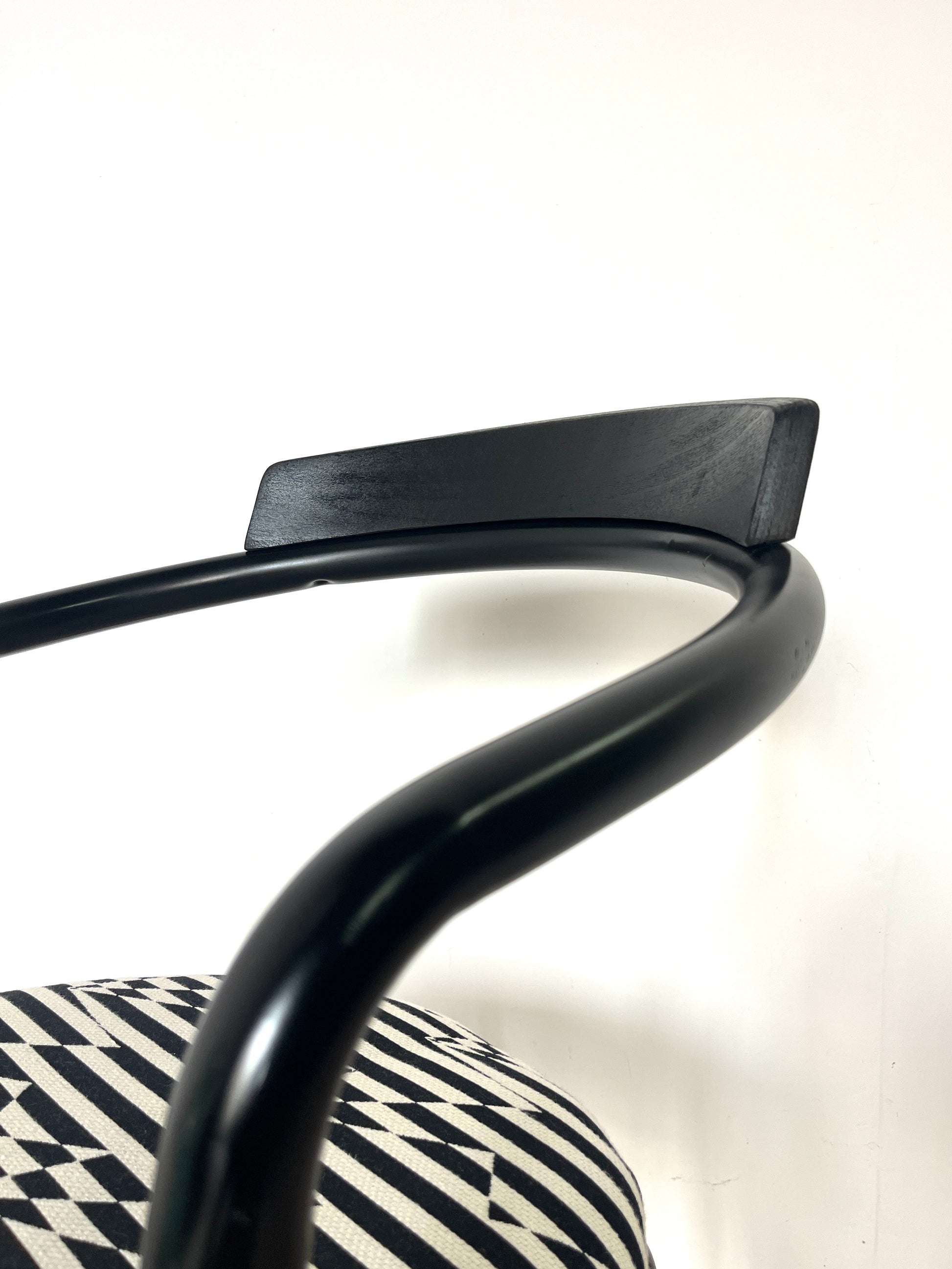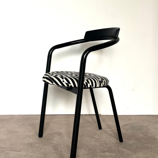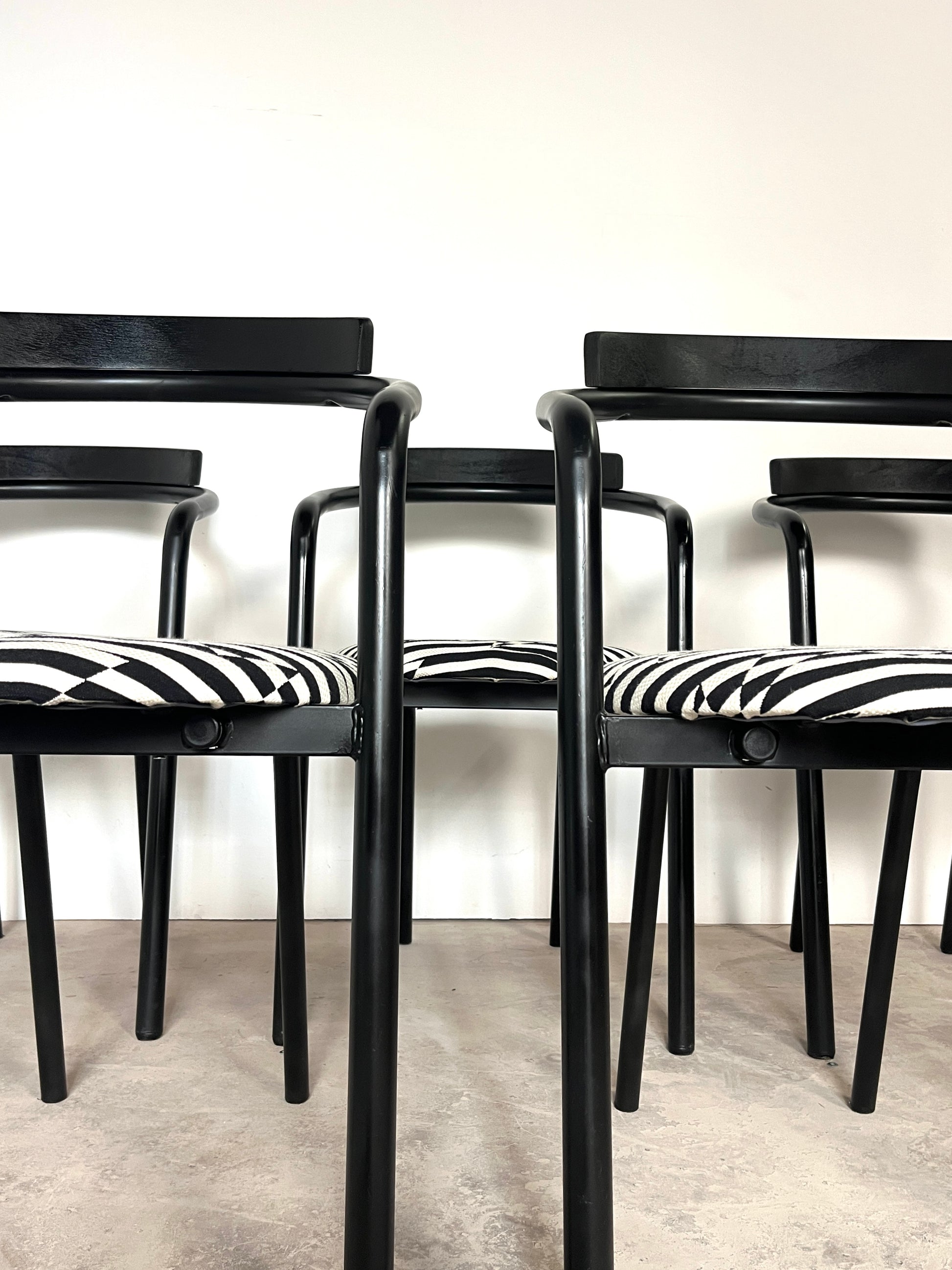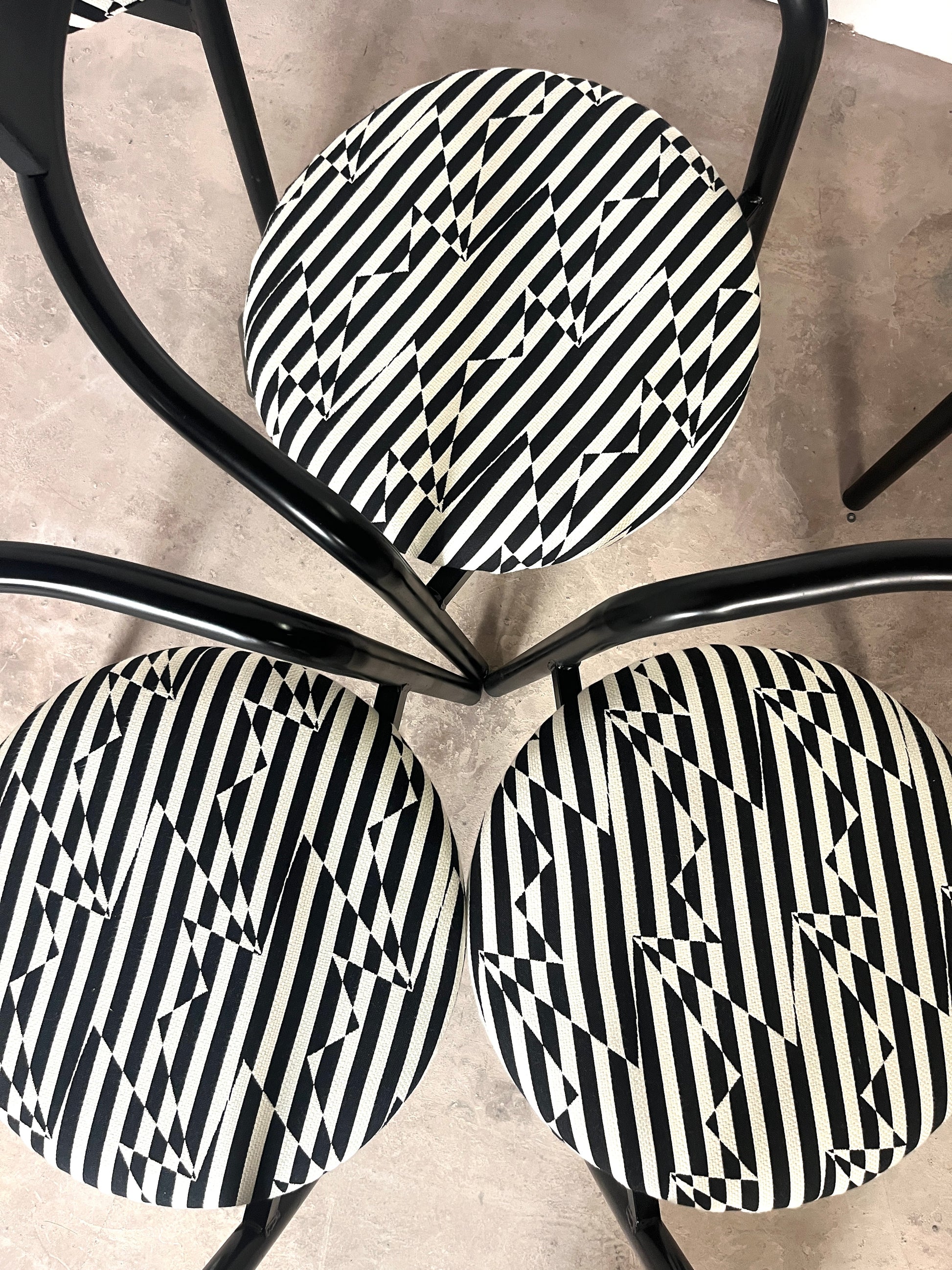 Leur structure en métal laqué noir est rehaussée d’une assise fraîchement retapissée avec un tissu d'ameublement de très belle facture, épais, résistant et au motif noir & blanc graphique. Le résultat : un contraste raffiné qui conjugue style et durabilité.