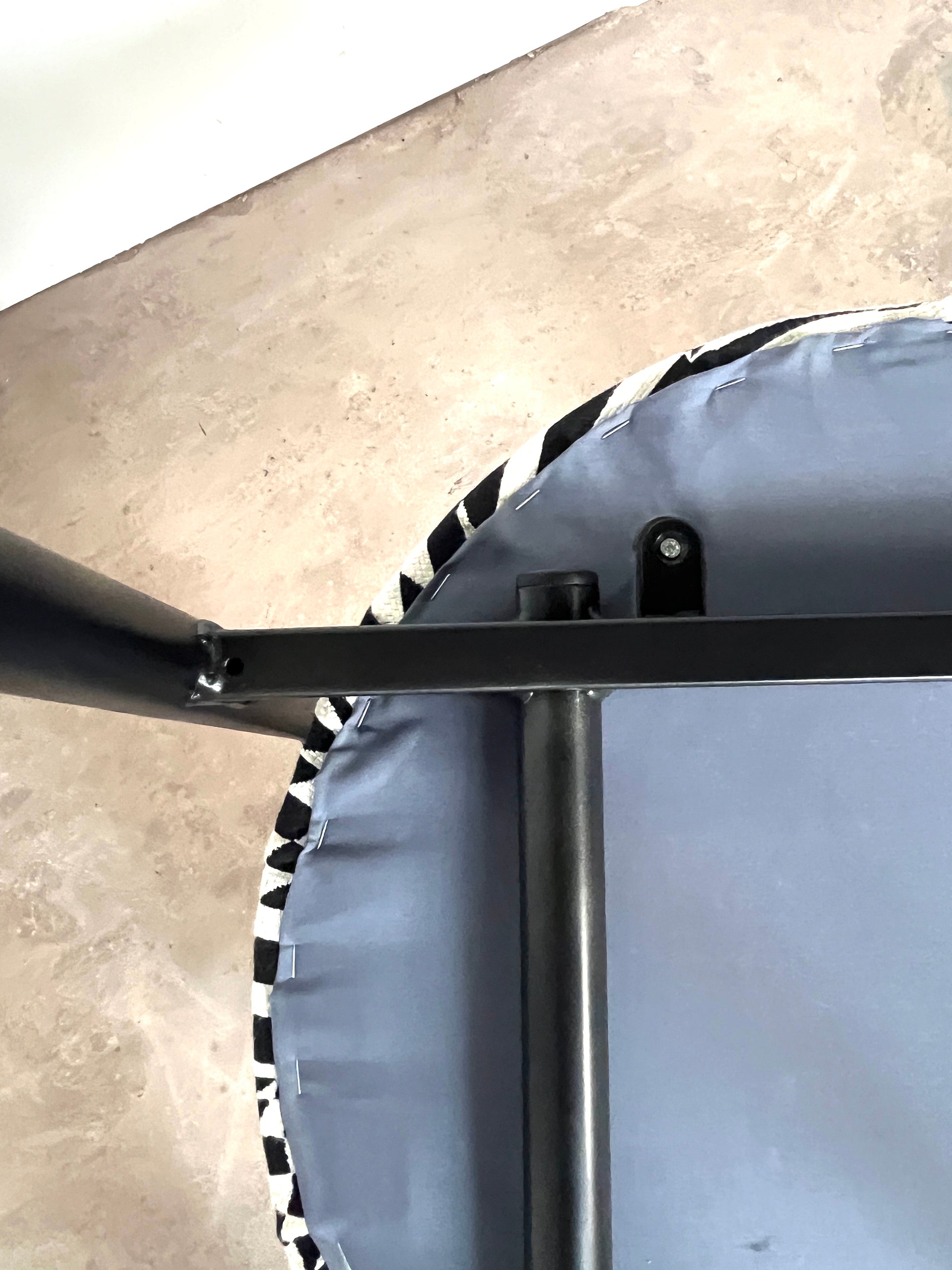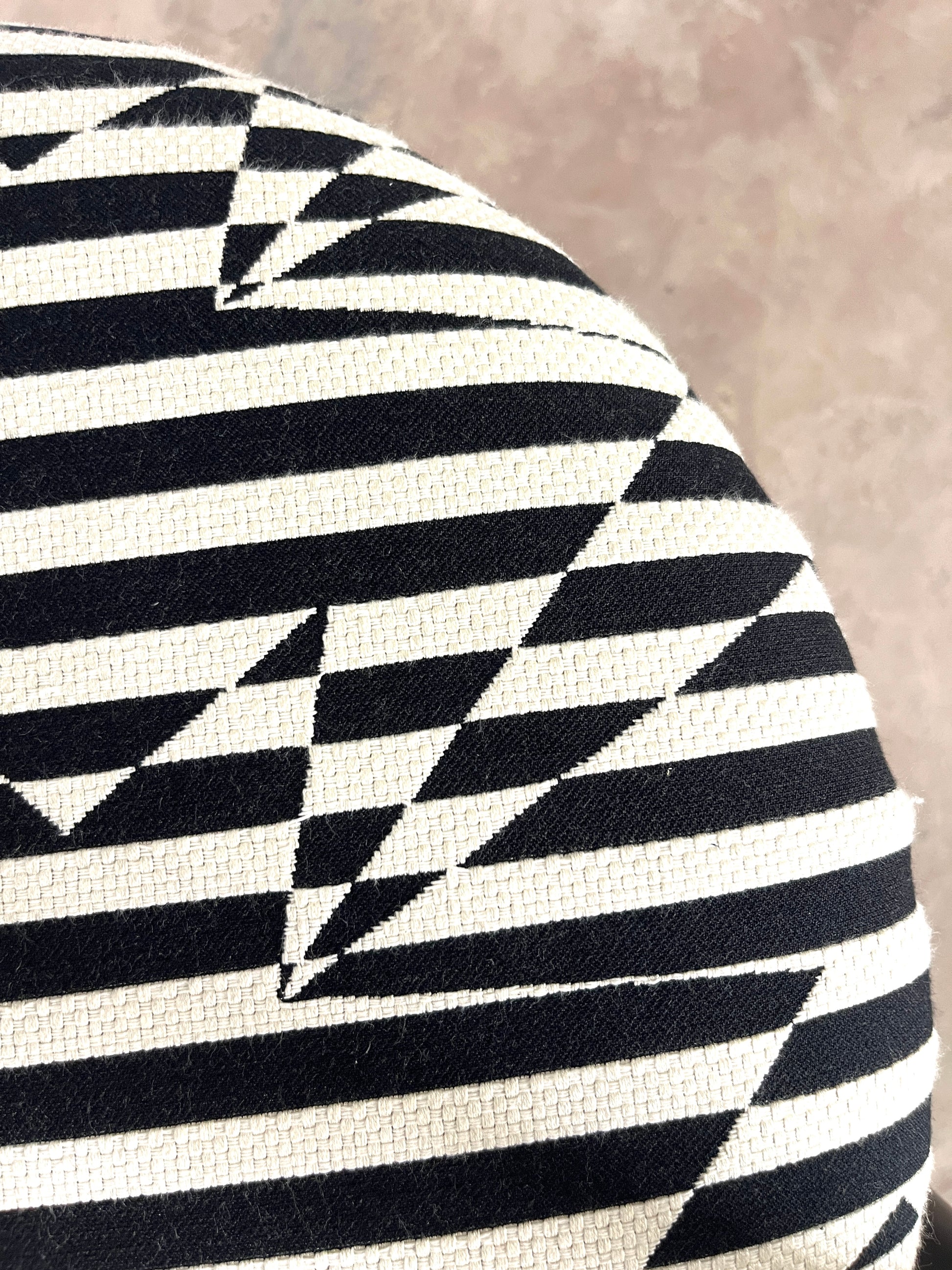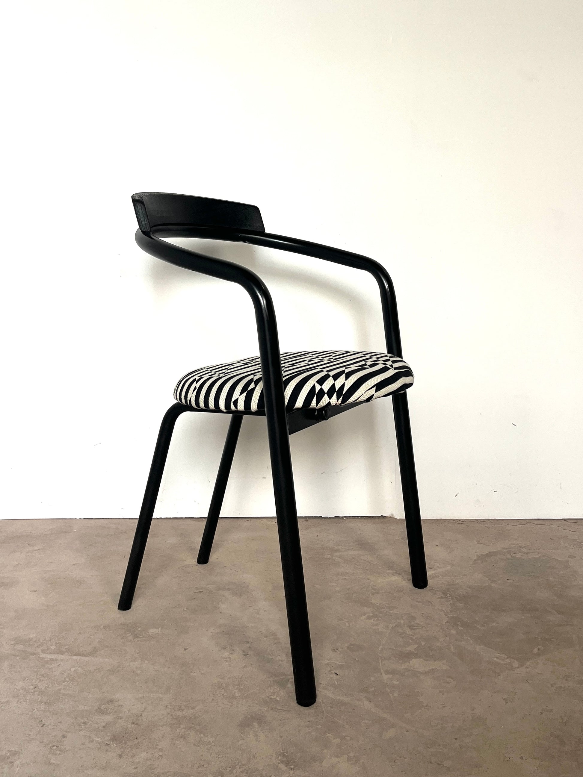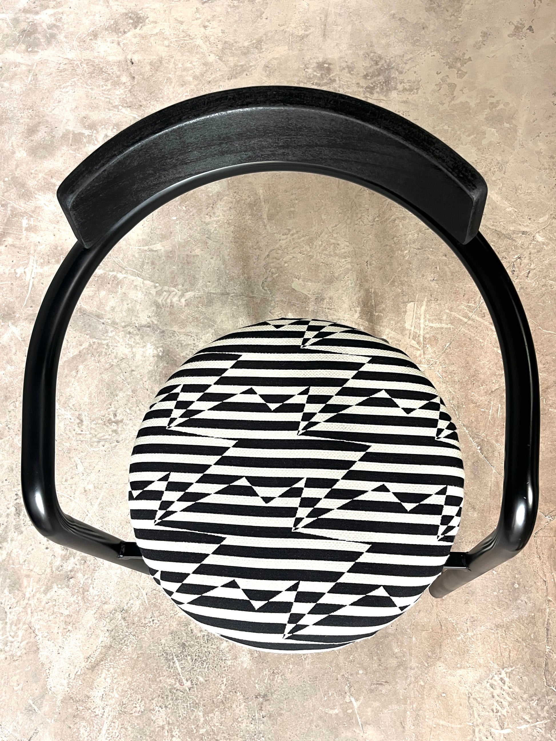 Leur structure en métal laqué noir est rehaussée d’une assise fraîchement retapissée avec un tissu d'ameublement de très belle facture, épais, résistant et au motif noir & blanc graphique. Le résultat : un contraste raffiné qui conjugue style et durabilité.