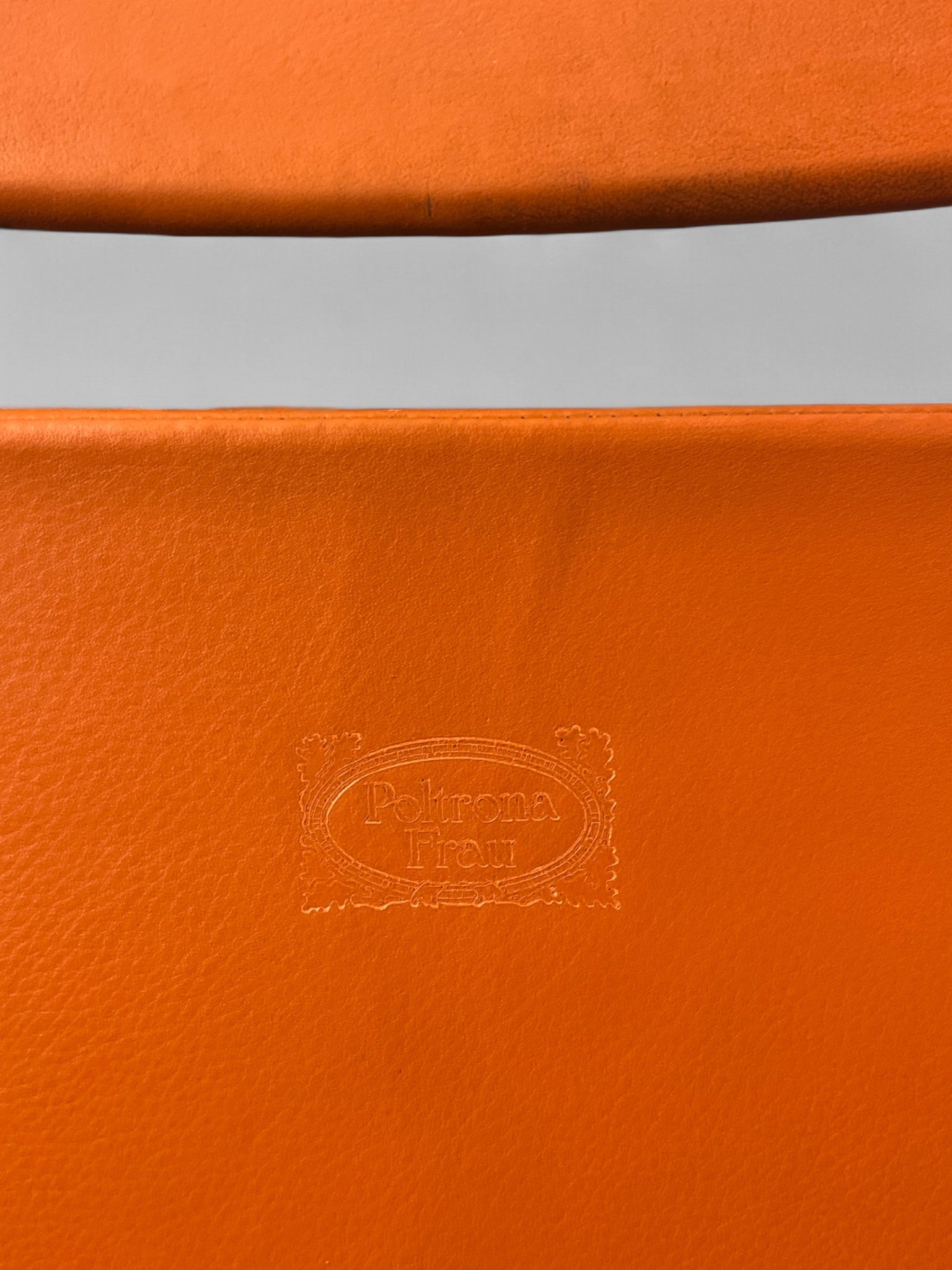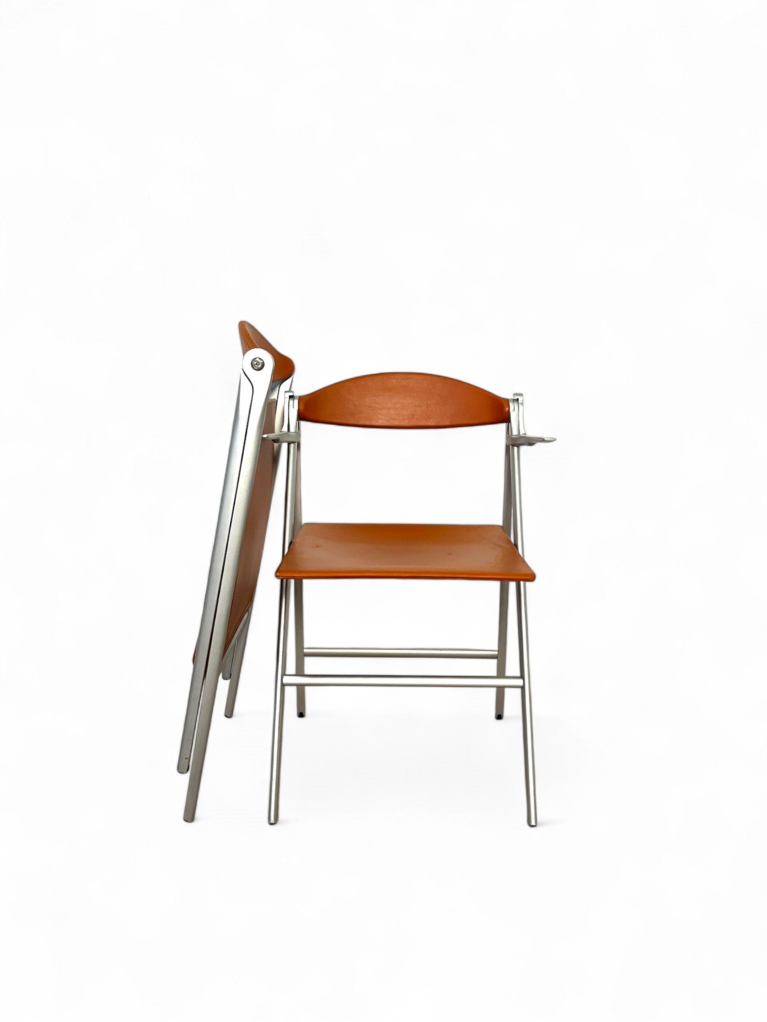 Très bon état général. Présentent quelques légères marques d'usure conformes à leur âge. Elles allient élégance et ingéniosité: leur structure en aluminium poli inspiré de l'aéronautique est d’une grande finesse, et l'assise évoque la forme du bec d’un canard et disparait totalement une fois repliée. Leur conception permet un pliage parfait et discret, tout en offrant un confort remarquable grâce à l’assise et au dossier, revêtus du célèbre cuir Pelle Frau, souple et résistant.