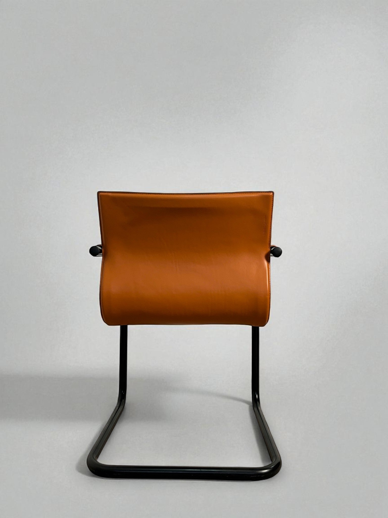 Les assises et dossiers sont en cuir tendu sur une structure tubulaire en acier chromé, conférant à l’ensemble une silhouette aérienne et graphique.